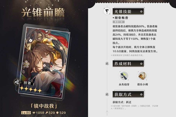 2.「镜中故我」:光锥「镜中故我」与阮梅的契合度极高,且数值给的非常慷慨,非常推荐有一定星琼储备的开拓者为阮梅抽取该光锥;对于星琼储备不足的开拓者,也可以使用4星光锥「记忆中的模样」,是性价比极高的下位替代,不需要强行抽;对于其他角色来说,如果角色没有带记忆/轮契提速缩轴的需求,并且没有特定词条需求,则可以考虑抽取,该光锥的泛用性极高。