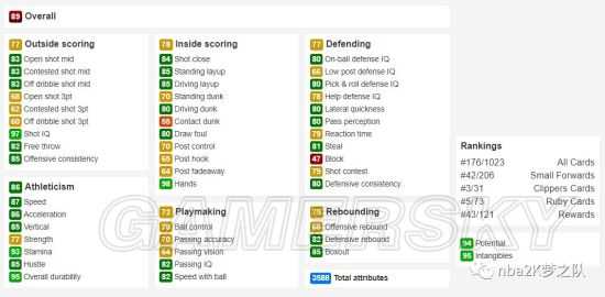 这张卡并没有将他的特点展现出来,整体属性看上去平平淡淡,没有一项特别突出的地方,作为外线球员仅有68的三分真是太低了。