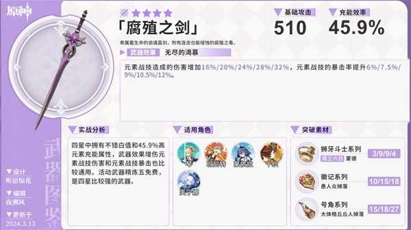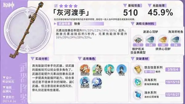 钓鱼武器,免费精五。高充能属性和元素战技暴击提升,也是比较适配芙宁娜武器