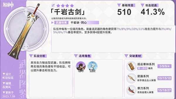 攻击副词的输出武器,需要搭配璃月角色多的队伍,所以更推荐本身璃月角色使用。目前深渊来说,北斗这种副C也优先考虑充能武器,而重云本身不挑武器,很多时候可能作为破冰工具人。所以千岩大剑目前就业面很低。