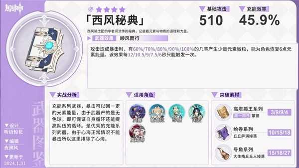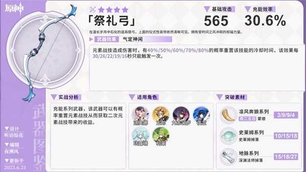 充能系列武器,重置战技意味着两次元素战技收益,适配于大部分副C和辅助使用。但推荐高精使用,低精容易触发不了重置。