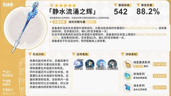 静水流涌之辉:超高暴伤词条武器,可以提升元素战技伤害和提升装备者生命上限,芙宁娜也可以轻松吃满武器效果。可以理解为该武器可以有效提升芙宁娜自身的伤害,芙宁娜除了辅助效果外,自身伤害也可观的。所以该武器是芙宁娜理想毕业武器。