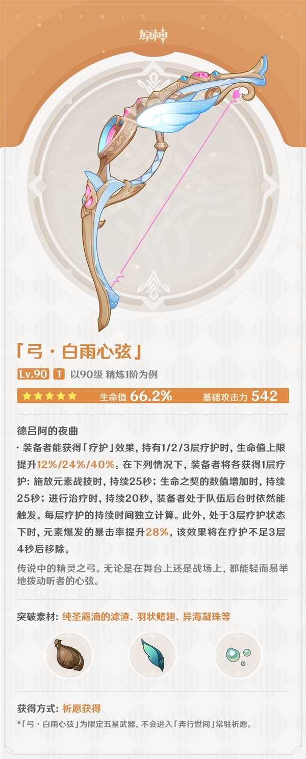 超高生命副词的弓,基本该武器独特的主属性目前也适合奶妈辅助使用。武器庇护效果进一步提升生命属性,可以理解为进一步提升保护和治疗能力。由于吃满需要生命之契,使用目前常规情况下应该只有希格雯才能吃满。