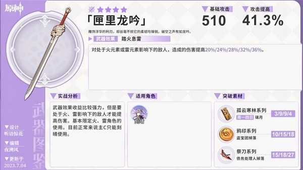 早期匣里龙吟是刻晴比较强力的四星毕业武器,随着越来越多的强力四星单手剑且五星限定双暴剑也比较多也强,所以匣里龙吟竞争优势很小,目前只推荐过渡用。