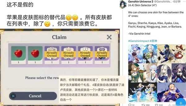 好消息是皮肤礼包实机图已经有了,有舅舅透露两个苹果图案分别代表的是申鹤甘雨,并且该界面并不完整,正式上线后旁边是会有下拉键的,到时会显示绫华可莉等其他人的皮肤头像!有舅舅也在刚刚爆料称大家等4.4前瞻直播就知道了,你米是懂流量的,除夕当天邮箱给个礼包,4星皮肤自选(就是除了迪卢克皮肤,其他皮肤选一个)+原石+一些材料,游戏活动还是正常送行秋皮肤,此外,还有璃月4星角色自选一个!