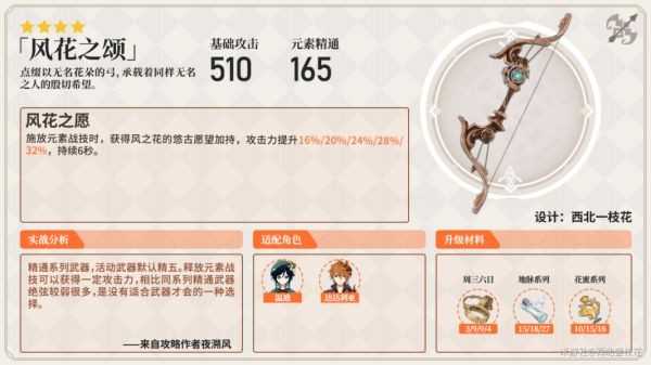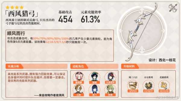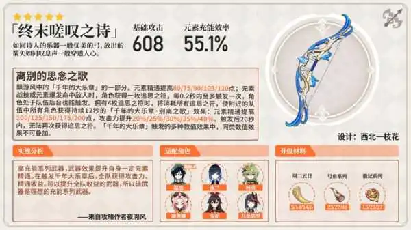 需要一定暴击率可用。为全队提供充能循环加成,是万金油武器,在任何场景下可用,唯一的缺点是会丢失伤害。