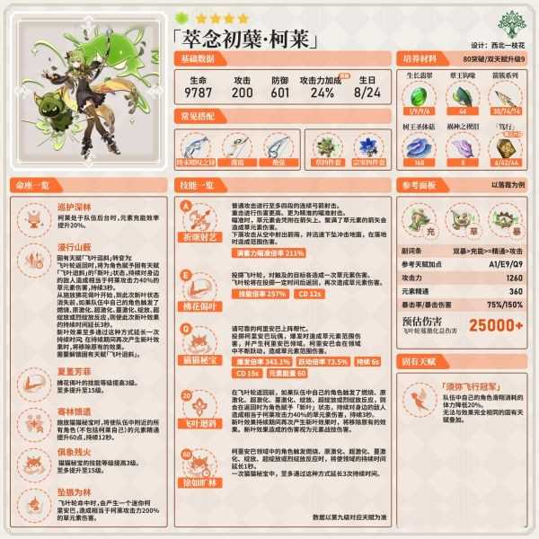 柯莱是一位中轴输出的脱手挂草反应副C定位的角色,目前比较适合辅助性打法,能在后台持续性为前台提供草元素环境。柯莱目前的输出伤害不是特别理想。主要提供草环境为队友提供反应环境,使元素反应更加多样化。