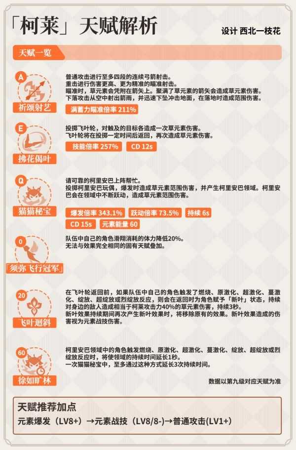 加点建议:给柯莱的元素战技升级可以改变释放元素战技时候的草元素伤害。这和激化反应共同作为柯莱的主要输出手段。建议作为次要提升的技能。