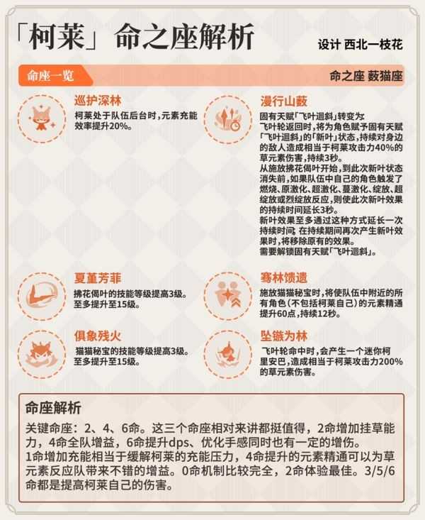 1命:增加20%的后台充能效率,是手感提升命座,提升的也是柯莱很需要的充能缺口。但是数值给的非常保守,第一是对比班尼特二命效果(30%充能提升),柯莱的20%显得缺少诚意;第二,后台充能本来就会大打折扣,这个限制条件我觉得有点过分。
