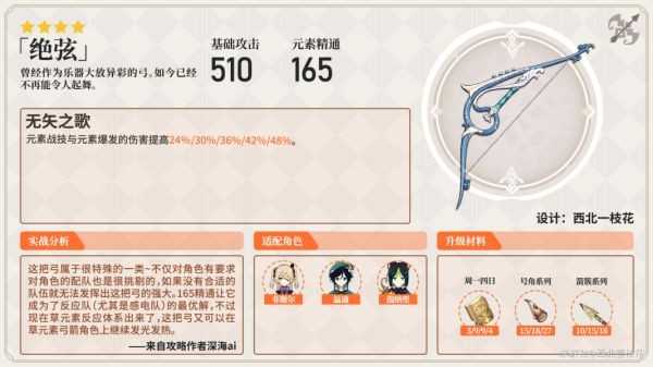 须弥的新锻造武器,相比较而言,优势没有其他武器那么大,精通相比绝弦来说还是稍微差了一点,但由于是锻造武器,获取方式也相对来说比较容易,也有比较不错的表现。