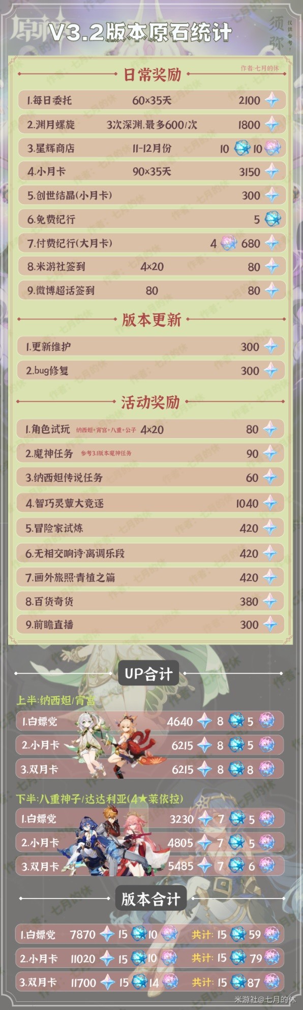 1.相比3.1的2周年版本,3.2版本原石显然缩水一大截,对于想抽角色的小阔爱稍微有点压力,这里“七休”就祝大家欧气满满了!