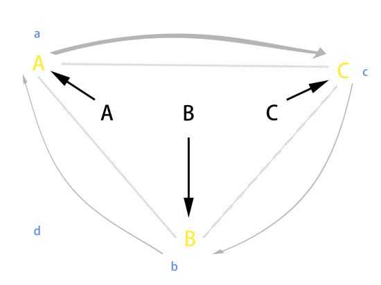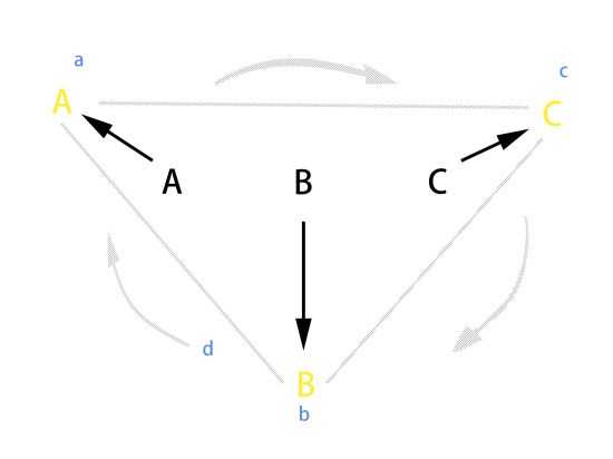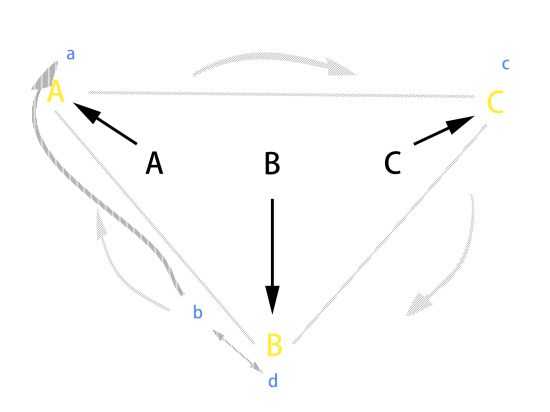 下图黑色字体为Boss刷新位置,此时boss成一排,并且脚下连着蓝色能量光线。玩家分别标记为小a,小b,小c,小d,a,b,c分别对应吸引A,B,C的玩家。图中玩家字体为蓝色字体。