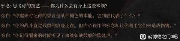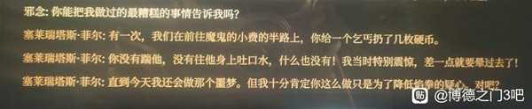 然后就是后来的发展,在落地后的第一次长休时会有以下对话,从这里可以看出邪念小时候对未来的期盼应该是当一位圣武士伸张正义,并且成功当上了圣武士,可是后来被巴尔所扭曲。