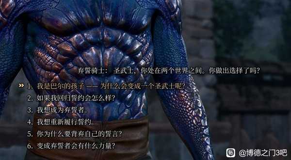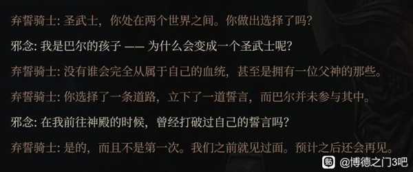 破誓后与弃誓者的对话也有绝对的证据来支持我的猜想,并且根据弃誓者所说的邪念似乎还在巴尔让他恶堕的过程中不断反复挣扎的破誓与赎罪。