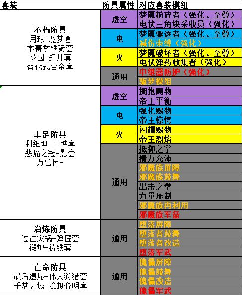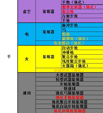 2.0装备推出之后,所有新装备都是带有属性的,为虚空、电、火三种之一,而每种属性对应武器模组的武器类型也是固定的,关系如下:
