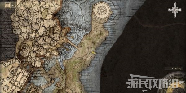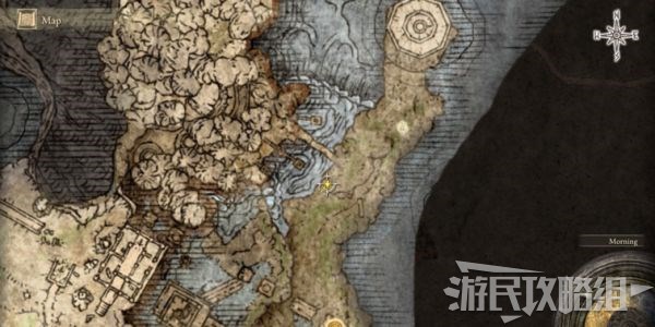点燃第五个火盆后往西走,穿过河流抵达另一座岛,火盆就在悬崖底部,旁边还有一颗大树。来这里的路上会遇到一只大螃蟹和很多幽灵战士,骑着马绕过它们就行,不用触发战斗。
