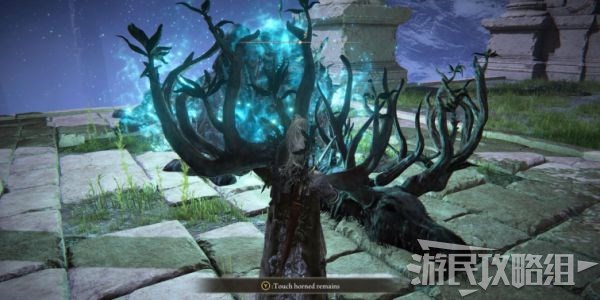 点燃所有8个火盆之后,返回赐福“希芙拉河(岸边)”,然后向东走前往角骸领地,此时可以看到入口处的8个火柱都被点燃了。尽头处有一个巨大的麋鹿头部遗骸,和鹿角互动就可以触发BOSS战了。