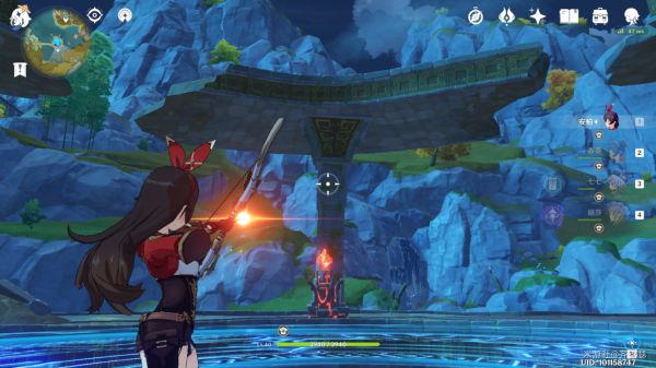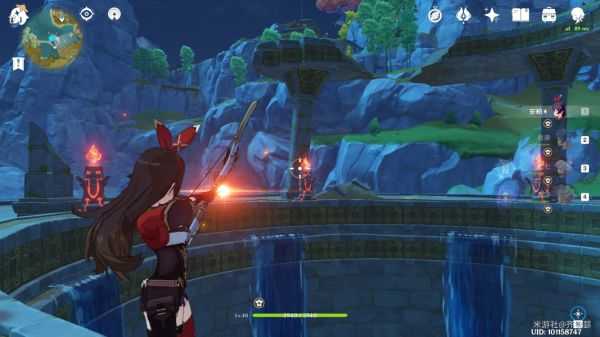 副本位于蓝色箭头这。这里有6个火炬,需要准备角色安柏这样效率高一点,同时火炬只需要点燃3个就能开启副本。