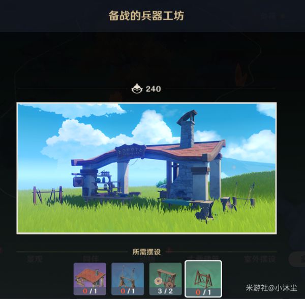 摆设:天衡赤枫-【红叶如灼】*1,花鸟喷泉*1,开放式烘炉工坊*1,古宅凉亭-【夜观七宿】*1