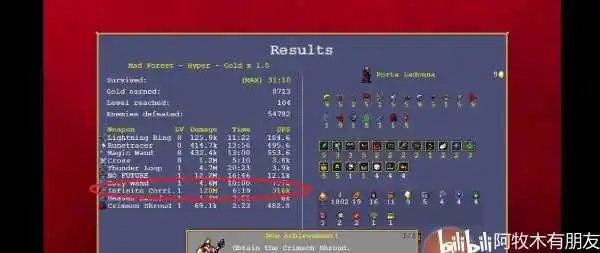 月桂超武——绯红裹尸布:需要两个红色的箭头来升级。一个箭头也是强化怪物,另一个是强化玩家的生命最大值和每秒生命回复。这个超武的效果不是非常明确,应该是周期性无敌,怪物对你造成的伤害不能超过10(或者固定为10),在无敌效果消失时对周围怪物进行复仇(具体怎么个复仇法不太确定,从上面的图里看,伤害并没有很高)。跟上面那个官方外挂比起来,这个超武没有那么出彩,当然它在生存方面的提升还是一如既往的给力的。