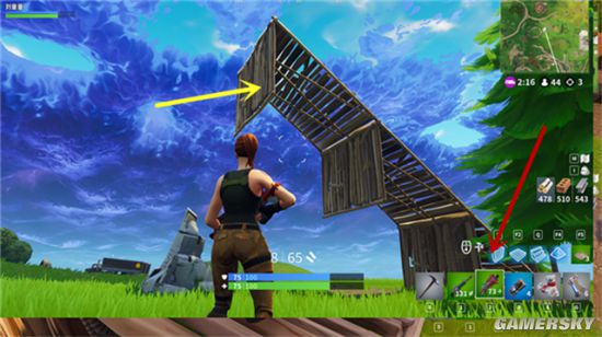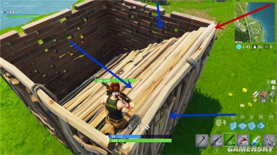 在实战中敌人也是可以建造堡垒来保护自身的,所以一旦局面僵持下来就会过于考验枪法,要是正好遇见一个持有狙击步枪的敌人就很难取胜了。众所周知,在对枪时往往站位越高获胜的几率越大(更容易攻击对方头部),而想要形成这种高打底的局面就需要建筑来配合了。如上图所示,利用连续的楼梯就可以增高自己的站位,但要注意高层建筑的地基一旦被打破就会全面坍塌。也就是说,只要将上图红色箭头所指的楼梯打破,增高站位的战术就不攻自破了。所以建议大家在使用楼梯增高站位的同时,建设上图黄色箭头所指的墙壁来保护楼梯。