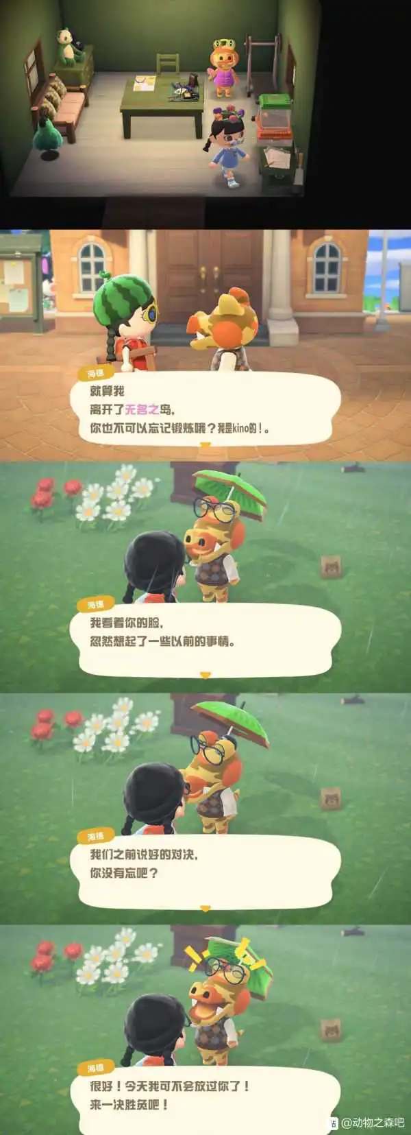 6、搬进来当天,岛上别的居民会说新的居民搬进来了,刷初始的小动物会对我的小号说,自己是新居民,你是我的前辈。之后还会说我习惯你的岛了,很愉快。基本跟第一次入住是一样的对话,但好感度还在。