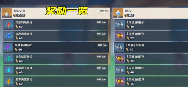 ● 原石、智识之冕、角色培养素材、天赋培养素材、大英雄的经验、精锻用魔矿
