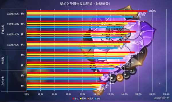 四套圣遗物收益如下图所示,以精1决斗之枪的收益为100%基准: