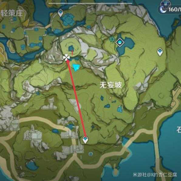 传送到无妄坡下的传送点然后跟着下面的路线图跟实际图去找璃月的地灵龛吧,到了第二个图的第二个箭头是可以看到有一个精灵,跟着它走也能到这个地灵龛