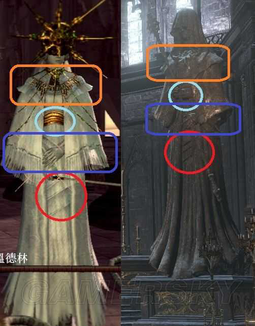 没错,通过2图之间同色区域的对比,你会发现暗月祭祀的衣服和葛温德林的月光长袍及其相似。就像是一个简化版本。