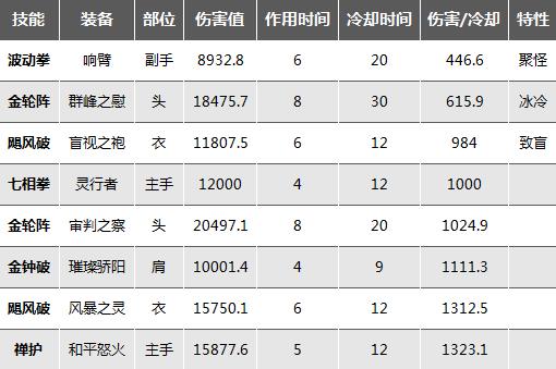 3.冲层时选择飓风破-盲视之袍(控制)+七相拳+金轮阵-审判之察,20秒打一个循环,略,飓风破-风暴之心+七相拳+金轮阵-群峰之慰(控制),一分钟打两个大循环加两个小循环,后者伤害更高。