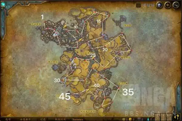 重新制作的路线图如下,野外一共有45个心能水晶碎片,2个在副本通灵战潮内,3个在晋升高塔内,加起来一共50个。那么旅途就从左上那个点开始咯~