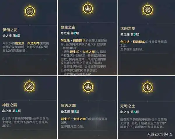 核心命座:2命、4命、6命,阿贝多的命座均提升不大,没有质变的命座,0命即可。