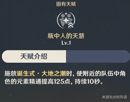 3.瓶中人的天慧:开大招后,提升队伍角色125点元素精通,属于增伤天赋,可以搭配打反应的队伍,提高阿贝多在队伍中的辅助能力,不再只是岩队。