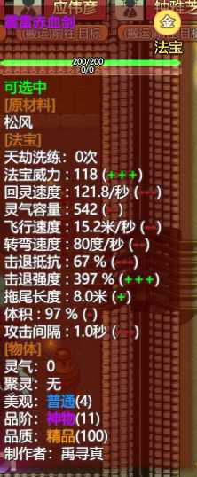 神器出来了,然而属性却很低,楼主猜测可能和物品的初始属性还有灵气有关。又炼制了以下法宝: