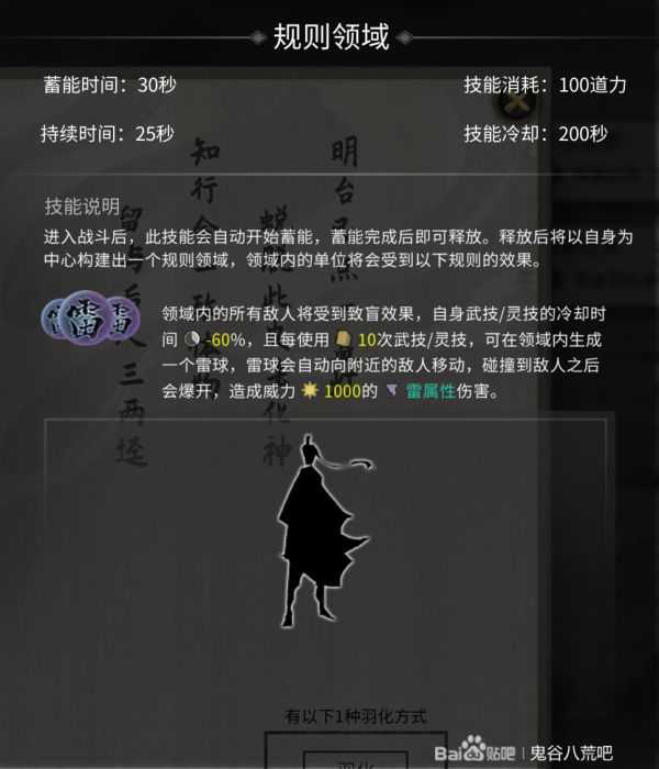 领域技能特效: 所有敌人致盲、武技/灵技冷却时间减少60%、每10次左键造成1000点雷属性伤害。