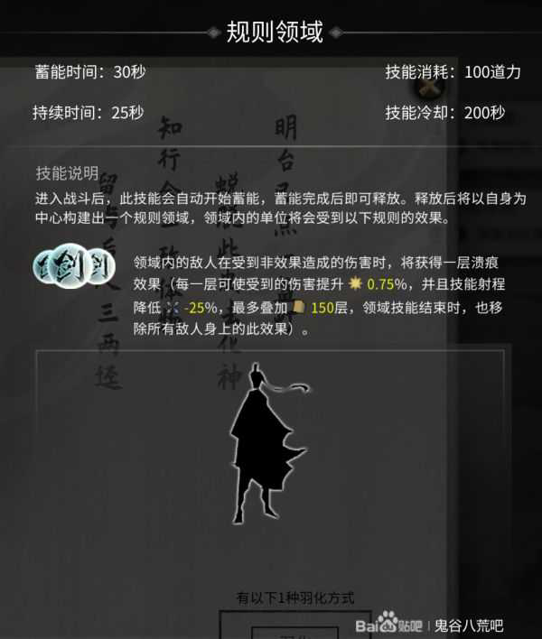 领域技能特效: 每层使受到的伤害提升0.75%,一共150层、并且降低技能射程25%。