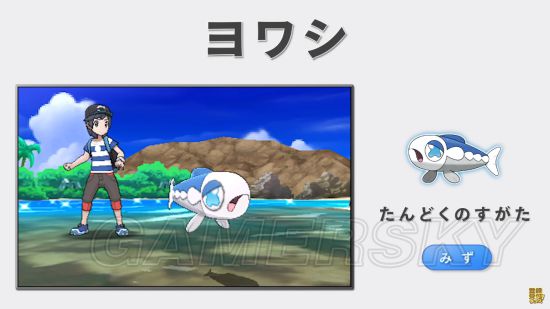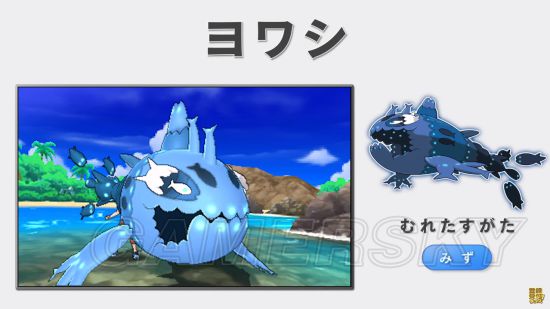 鰯「ヨワシ」,属性水,特性鱼群,会从单独形态切换到群聚形态,HP降低到一定程度以后会变回单独形态;