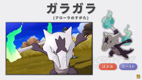 嘎啦嘎啦(奥罗拉形态),属性火+幽灵,在进化前的卡拉卡拉与关东形态一样;