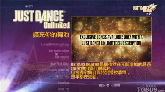 本次的2017在游戏画面依旧承袭着该系列的一贯作风,没有太多写实风格,使用较为鲜明的色彩组成梦幻般的动画风格。在有了极具风格性的画面作为衬托,一款音乐舞蹈游戏最为重要的自然就是曲目与舞蹈的编排。进入游戏,选择just dance会看到本次新增的歌曲,而前作所累积的歌曲还可以通过线上串流服务JustDanceUnlimited来找到,并且很人性化的向玩家提供了90天的歌曲免费体验,只要好相应的补丁就能在游戏中看到JustDanceUnlimited中的歌曲,如此看来因为这些曲目的存在,游戏看起来也变得有趣许多,不过前提是要育碧的服务器先稳定下来。