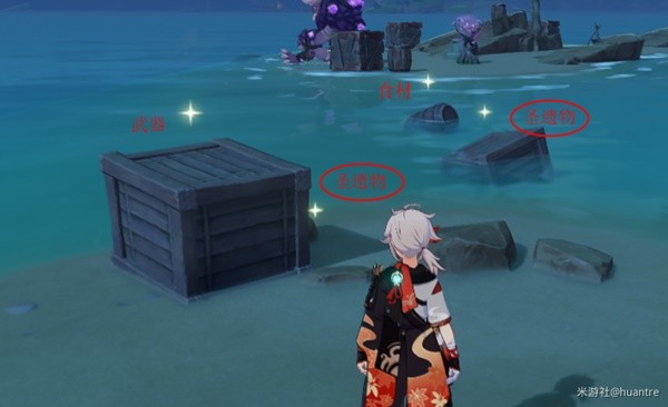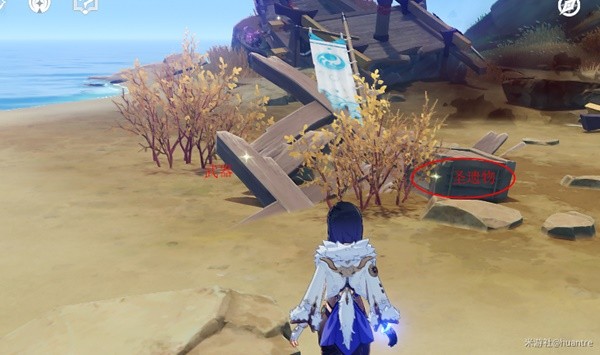 然后朝西南方向,两艘破船(2处调查点),火盆旁边有两个木箱子(摩拉)。