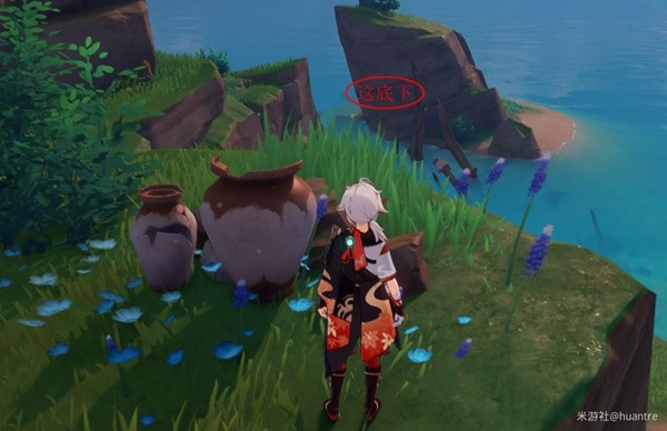然后朝西偏南一点,木屋前有一艘破船(圣遗物),其他的是(摩拉)。