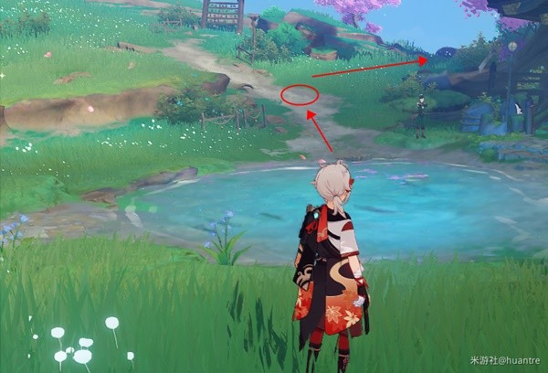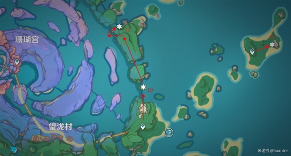 传送锚点出来,往右边走,水中间石像(调查点)。