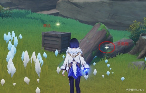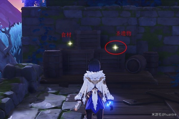 爬上去,正前方有两个箱子一个木桶(调查点)。然后上坡,最上边有一堆乱石两个箱子一个木桶(调查点),然后下坡,最下边有一个箱子(圣遗物)一个木桶(食材)。