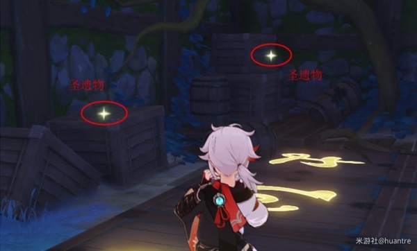 地下有四个调查点,相近的两个是(圣遗物),墙角破桶的是(矿石),另外一个墙角的是(食材)。