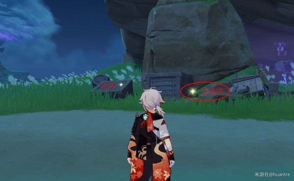 七天神像出来,左前方有一间木屋,靠石墙的箱子,左边的是(食材),右边的是(圣遗物),紧挨木屋的箱子(矿石)。