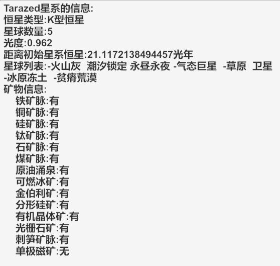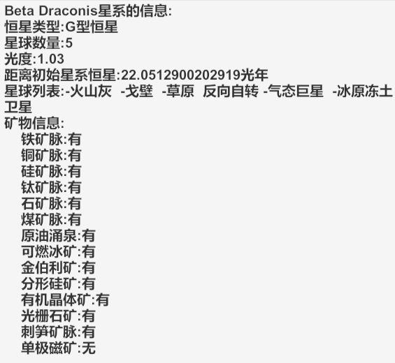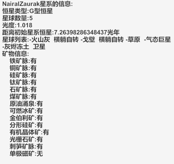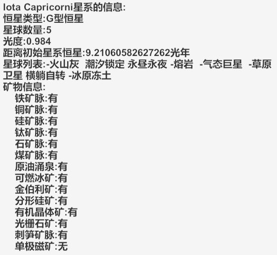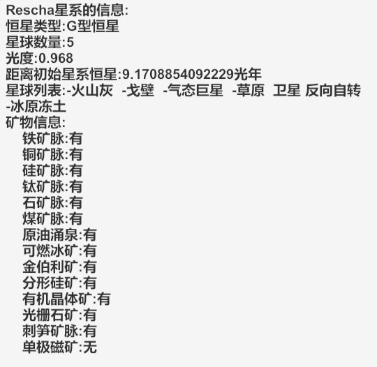 此次搜索的条件为:G型恒星(星系大小和光度适中),带火山灰(硫酸)行星、草原行星、气态巨星、除单极磁石之外全稀有矿脉。