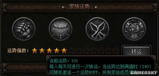 家族运势每日0点进行随机运势点数重置,所有成员可通过转运功能提升运势指数,当日活跃值若达到峰值时,则将随机激活如下的一类buff增益。