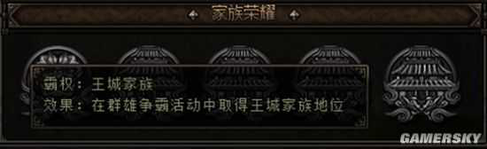 家族荣耀功能记录了家族参与游戏世界中的成就,不论是参与群雄争霸活动中取得王成家族地位、还是家族据点战中占领1座城池,都可以在家族荣耀里重重的落下一笔,获得全员强力buff效果。