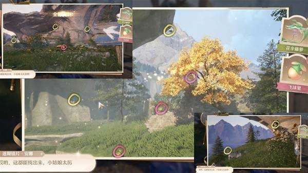 与迷糊镜片安娜对话,在三张照片中寻找多个花伞藤萝与飞球果,位置如图所示